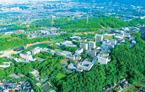 約40万平方メートルの愛知県春日井市の緑豊かな丘の上のワンキャンパスに、8学部27学科4専攻、大学院6研究科19専攻が集い、四季の移ろいを感じながらキャンパスライフを送っています。