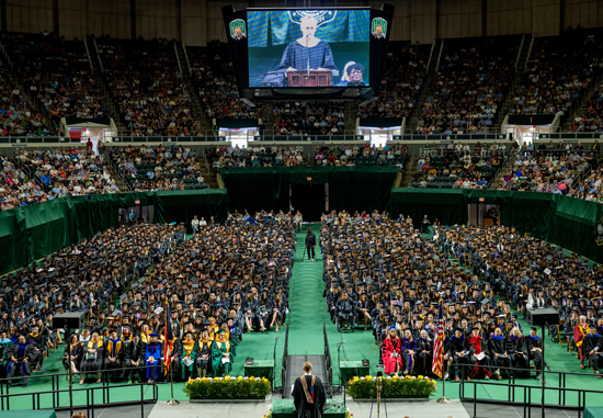名誉学位の授与は、オハイオ大学の約1,000名の大学院修了生と関係者が出席する式典の冒頭に行われました。シャーマン学長とセイラス副学長による飯吉理事長・名誉総長の功績の紹介の後、家総長のスピーチに続いてシャーマン学長より授与されました。家総長がスピーチの中で、両大学の協定締結50周年を記念して中部大学より新たに50本の桜の木を寄贈することを発表した際には、聴衆から拍手が沸き起こりました。
